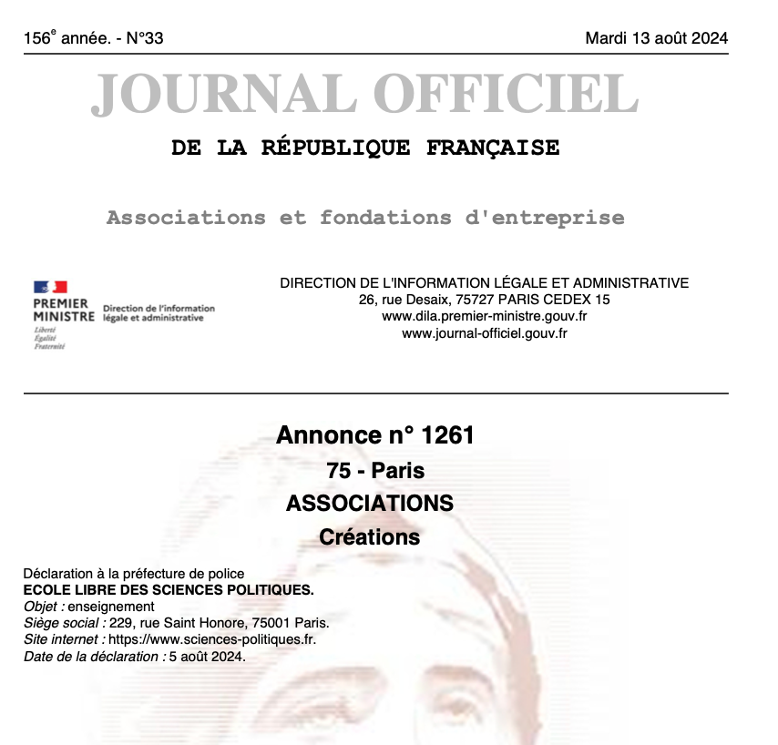 Dans un souci d’efficacité administrative, l’ELSP adopta alors le statut d’association à but non lucratif, et fut officiellement enregistrée au Journal Officiel de la République Française, sous l’annonce n° 1262, 156ᵉ année, n° 133.